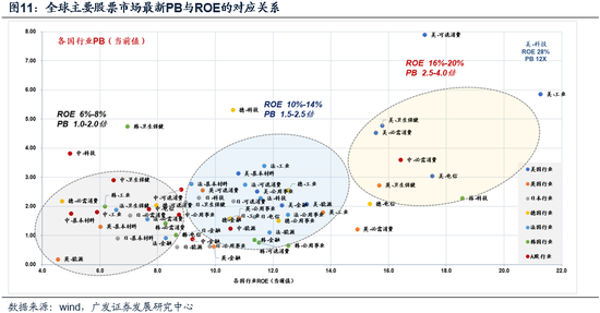 首先,ROE位于16%-20%,对应PB在2.5倍-4.0倍。这一圈层主要是美国的各类行业,它们具备了技术壁垒、品牌溢价、全球化、回购分红等有利条件。